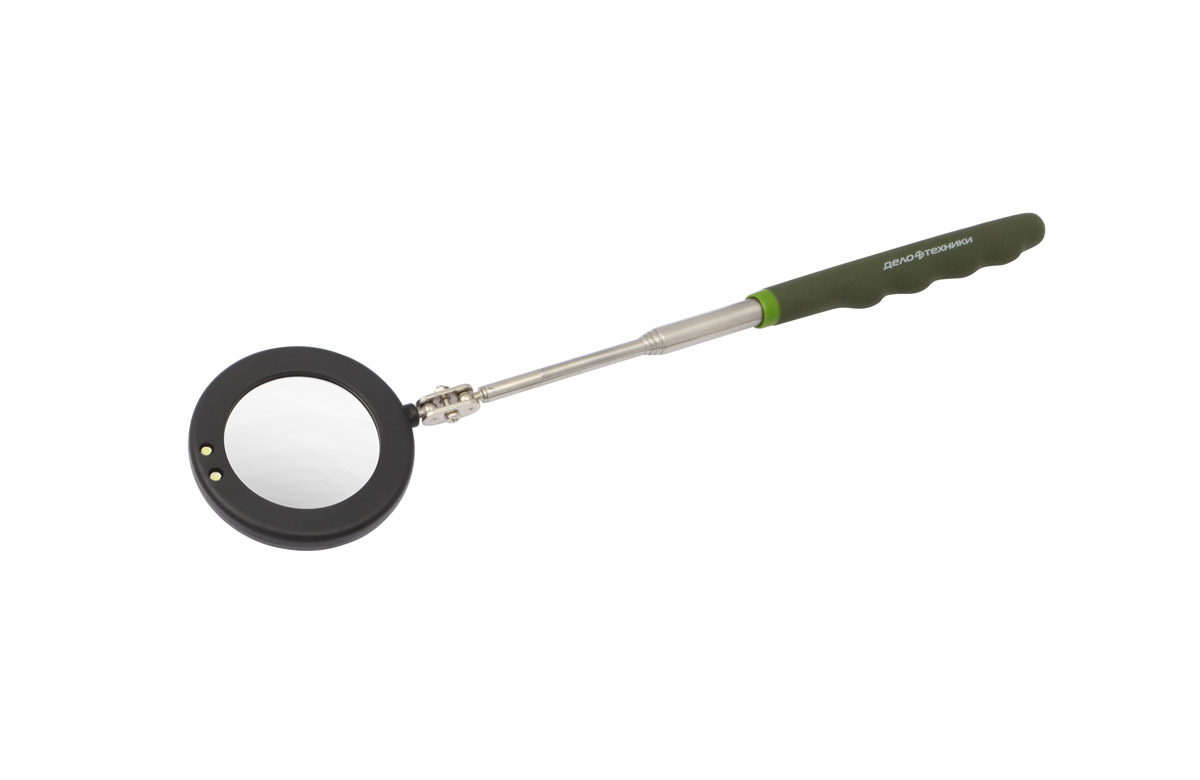 Шарнир позволяет выставить необходимый угол зеркала, а телескопическая конструкция обеспечивает доступ к самым труднодоступным местам. Подсветка избавляет от необходимости дополнительно освещать осматриваемую деталь.