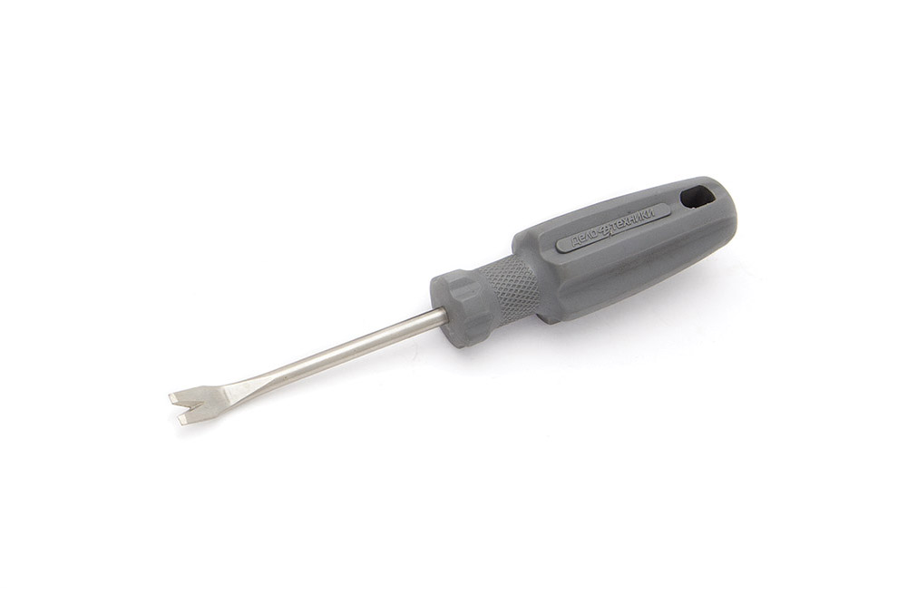 Съёмник применяется для демонтажа пластиковых пистонов обшивки дверей и панелей автомобиля. Инструмент оснащён удобной пластиковой рукояткой.