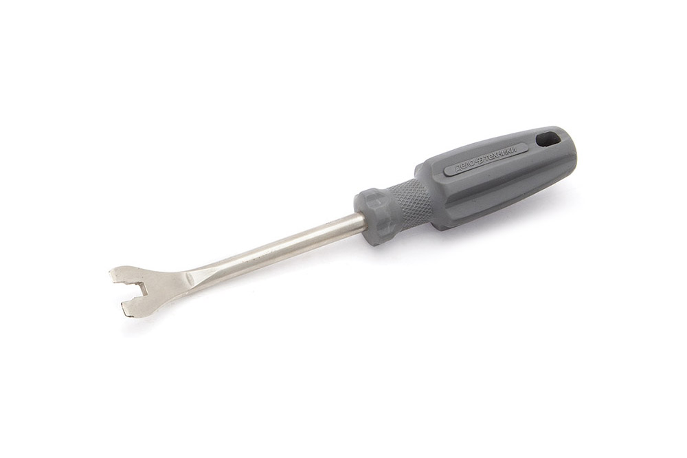 Съёмник применяется для демонтажа пластиковых пистонов обшивки дверей и панелей автомобиля. Инструмент оснащён удобной пластиковой рукояткой.