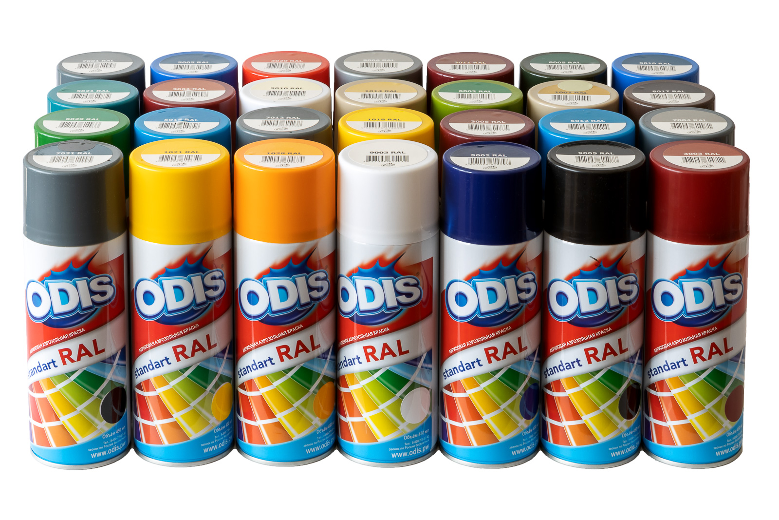 ODIS spray paint Standart RAL – обладает отличной укрывистостью, атмосферостойкостью и высокой адгезией к большинству поверхностей из различных материалов. Поворотный распылитель позволяет равномерно и экономично нанести краску на поверхность различных предметов. Полностью высыхает за несколько минут. При объеме 450 мл - вес готового пигмента (масса нетто) 290гр, что позволяет одним баллоном окрасить до 2.5 кв.м. в зависимости от цвета, количества слоев и типа обрабатываемой поверхности. Цвет соответствует европейскому стандарту RAL.