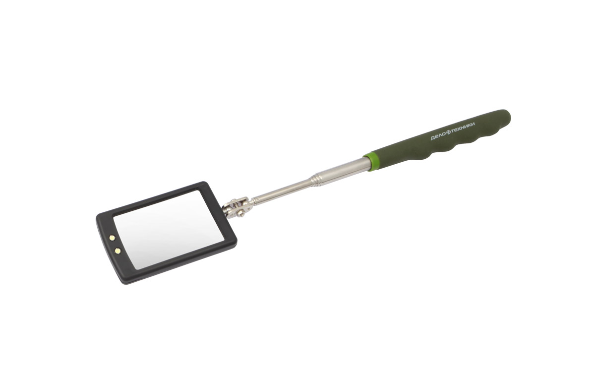 Шарнир позволяет выставить необходимый угол зеркала, а телескопическая конструкция обеспечивает доступ к самым труднодоступным местам. Подсветка избавляет от необходимости дополнительно освещать осматриваемую деталь.